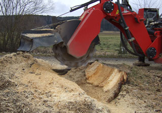 Für die leistungsstarke Anbaufräse ist kein Baumstock zu gross.